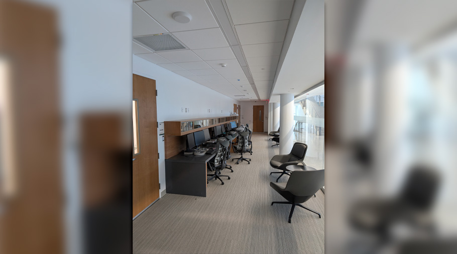The microscope rooms in the EMC were designed to minimize vibration, acoustic interference, stray magnetic fields, and fluctuations in temperature and humidity (maintained at <30%). Located on the first floor of the Frost Building, the EMC houses state-of-the-art ThermoFisher electron microscopes facilitating precision imaging from atoms to cells.